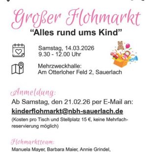 | Anmeldezeitraum: | Ab: 21. Februar 2026 Per E-Mail an: kinderflohmarkt@nbh-sauerlach.de Vorabanmeldungen werden nicht berücksichtigt!! Bitte beachten Sie, dass es sich um einen reinen Kinderflohmarkt von Privathaushalten handelt und Gewerbetreibende nicht zugelassen sind. |